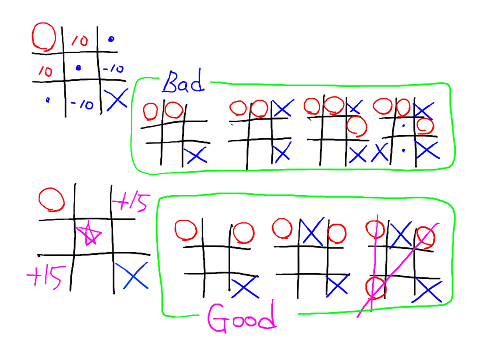 パターン4 対角 ふむ。今までのパターンが使えない。 10点のところに置くと、勝ち目がないどころか負けてしまう。 正解は残りの角を狙うこと。 特別ルールでも作りますか。割と安易に。 特別ルール 中央を空けて対角でにらみ合いが発生した場合、残りの角を優先する 優先するためには10点以上与えないといけない。+15点ぐらい出しておくか? ブログエントリ ○×ゲームを作る(1) http://http://hiyayakkoprog.blog.shinobi.jp/Entry/53/ ダウンロードHP http://hiyayakko.sarashi.com/Marubatu/MaruBatu.html したらば掲示板 http://jbbs.livedoor.jp/bbs/read.cgi/computer/42268/1251347335/-100 PR |