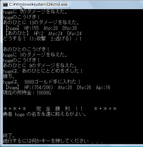 ほんと数日でかなりの高みに登ってしまった。 C++を極める道はまだまだ先が長いんだけど、コンソールRPG編はあと数回で 完結できると思う。 できるか分らないことを、参考書片手にとりあえずやっつけてみる。 出来たソースに電気が流れないと、どうにも理解できない。 この規模のプログラムで、すでに俺の理解を超えて「書いてみたらできた」部分が 結構出てきてる。 ダウンロード Entry023.zip (2009.08.03) セーブロード完備できてしまった。 まずはセーブから。ホントはロードから作ったんだけど、結果的にセーブを先に 作るほうが早かった。 main.cpp #include <iostream> #include <string> #include <sstream> #include <stdlib.h> // 乱数取得に必要 #include <time.h> // rand()の初期化に必要 #include <windows.h> // 表示のウェイトのためだけに。 #include <list> #include <fstream> using namespace std; : : // セーブ処理 /*void Save(Player &p) { fstream file; string sstr = p.GetSaveTxt(); file.open("savedata.dat",ios::out); if(file.is_open()){ file << sstr; cout << "Save Success...\n"; } file.close(); }*/ // セーブ処理 void Save(Player &p) { ofstream ost("savedata.dat"); ost << p.GetSaveTxt(); if(ost) cout << "Save Success...\n"; ost.close(); } 最初に作った、今までの方法が上のコメント式。 ファイルストリームを指定してファイル「savedata.dat」を開く。 ファイルのオープンに成功したらセーブ用に準備した文字列を書きこむ。 開いたファイルハンドルは必ず閉じる。お約束。 下側の、今回利用した方法は苦労の結晶。 ロードのときにいっしょに説明入れる。 Player.h class Player : public Unit { public: bool Stay(int price); // 宿に泊まる void AddMoney(int gd); // 金額加算 void ShowAllStatus(); void Training(TrainingMenu tM); // 強化訓練(3種) int TrainingCost(TrainingMenu tM); // 強化コスト string getShowHP(); string GetSaveTxt(); // セーブ用の文字列を作る }; : : string Player::GetSaveTxt() { stringstream sstr; sstr.str(""); sstr << Name << " " << MaxHP << " " << Atp << " " << Dfp << " " << Agi << " " << Money; return(sstr.str()); } セーブデータ用の文字列を作る。 メンバ変数にして隠蔽してるから、それならちゃんとPlayerクラスに仕事してもらわないと。 で、作ったSave()関数呼び出して、セーブできるようにする。 先にロードから作ったおかげで、問題点を先回りして解決できた。 コンストラクタに傷ついた現在HP入れてなかった。そういうのは考慮してなかった。 セーブロードのために初期化を変更するのも大袈裟な話なんで、それなら話はひとつ。 セーブできるのは、宿屋に泊った(HP=最大)のとき限定。 そういうわけで、宿屋のところに追加してみる。 main.cpp Result TownEvent(Player& player) { Result res; int cmd,cmdcnt = 0; static int stayPrice = 10; cout << "\n\n街にいます。\n"; while(1){ cmd = 0; res = NONE; player.ShowAllStatus(); cout << "\n1:出撃\n" << "2:宿屋(" << stayPrice << "G) 体力 " << player.getShowHP() << "\n" << "3:体力強化(" << player.TrainingCost(THP) <<"G)\n" << "4:攻撃訓練(" << player.TrainingCost(TAtk) <<"G)\n" << "5:防御訓練(" << player.TrainingCost(TDef) <<"G)\n" << "6:素早さ (" << player.TrainingCost(TAgi) <<"G)\n" << "9:終了\n" << "どうする?"; if(cmdcnt){ cin.clear(); cin.ignore(); } cin >> cmd; cout << "\n"; switch(cmd){ case 1: // 出撃 res = DEPARTURE; break; case 2: // 宿泊 if(player.Stay(stayPrice)) Save(player); break; case 3: // 体力強化 player.Training(THP); break; Player.h class Player : public Unit { public: bool Stay(int price); // 宿に泊まる void AddMoney(int gd); // 金額加算 void ShowAllStatus(); void Training(TrainingMenu tM); // 強化訓練(3種) int TrainingCost(TrainingMenu tM); // 強化コスト string getShowHP(); string GetSaveTxt(); // セーブ用の文字列を作る }; : : bool Player::Stay(int price) { if(HP == MaxHP){ cout << "体力満タンです。 " << getShowHP() << "\n" << "泊まる必要ありませんよ。\n"; } else if(Money >= price){ cout << Name << "は、宿に泊まった・・・\n体力が全快した。\n"; HP = MaxHP; Money -= price; return true; } else { cout << "お金がたりませんよ!\n"; } return false; } 宿屋ひやかすだけでセーブできる → 終了再開で体力回復とかは嫌なんで、 Stay() 関数に宿泊の成否判定を持ち込む。 超むかし、パスワード記録の時代のファミコンRPGにはあったんだけど、 終了再開にひと手間かかるから、それ考えたら割に合うかどうか。 以前、Stay() (宿泊)関数に成否判定入れるのを嫌ってたような気がするんだけど。 まあいいや。 いちおうこれで、セーブできるようになったと思うので確認してみる。 このセーブデータに対応したロード関数を作る。 main.cpp /* // プレイヤーデータのロード // 戻り値はファイル処理の成否ではなく、プレイヤーがデータを使用するとき true // ロード失敗(初回でデータが無いときなど)、および NewGame 選択時に false bool LoadData(Player &player) { ifstream ist("savedata.dat"); if(!ist) return false; string name; int HP, Atp, Dfp, Agi, Money; ist >> name >> HP >> Atp >> Dfp >> Agi >> Money; ist.close(); player.Init(name,HP,Atp,Dfp,Agi,Money); cout << "Load Success...\n"; player.ShowAllStatus(); cout << "\n\n"; cout << "前回のデータをロードしますか?(Y/N):"; char c; cin >> c; if(c == 'y' || c == 'Y'){ return true; } return false; } void InitPlayer(Player &player) { if(LoadData(player)) return; string name; cout << "あなたの名前を入