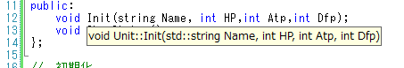 自分ひとりのプログラムだとどうでもいいレベルの話なんだけど、インテリなんとかに頼りたい気分のとき、 変数名がクラス定義してる変数と同じなほうがわかりやすいよね。 みたいな。 public: void Init(string Name, int HP,int Atp,int Dfp); void ShowStatus(); }; // 初期化 void Unit::Init(string Name, int HP, int Atp, int Dfp) { cout << "Init:"<< Name << "\n"; this->Name = Name; this->HP = HP; this->Atp = Atp; this->Dfp = Dfp; } インテリなんとか、こんな感じ あと、クラスや関数定義は先頭大文字、変数は先頭小文字みたいな統一感が欲しいので mainのPlayer、Enemyの表記を変えてみた。 Unit player,enemy; player.Init("ゆうしゃ", 30, 8, 5); enemy.Init("ゴブリン", 12, 6, 3); もう1点、パラメーター表示部分で名称のぶれがあったので変更。 本気でどうでもいい俺の美学。 // パラメーター表示 void Unit::ShowStatus() { cout << "【" << Name << "】 HP:" << HP << " Atp:" << Atp << " Dfp:" << Dfp << "\n"; } 画面取り込んだ後に気がついた。 また画面取り直してブログのほう修正するのも面倒な話。 ところで、画像サイズ100%で表示する方法がわからん。 まあ、このNinjaBlogに付き合ってたら不意にわかるときがくるかもしれん。 PR |